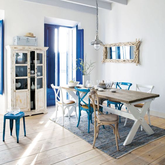 Les tons blancs et bleus dominent souvent, rappelant les maisons blanchies à la chaux des îles grecques et le bleu profond de la mer Égée.